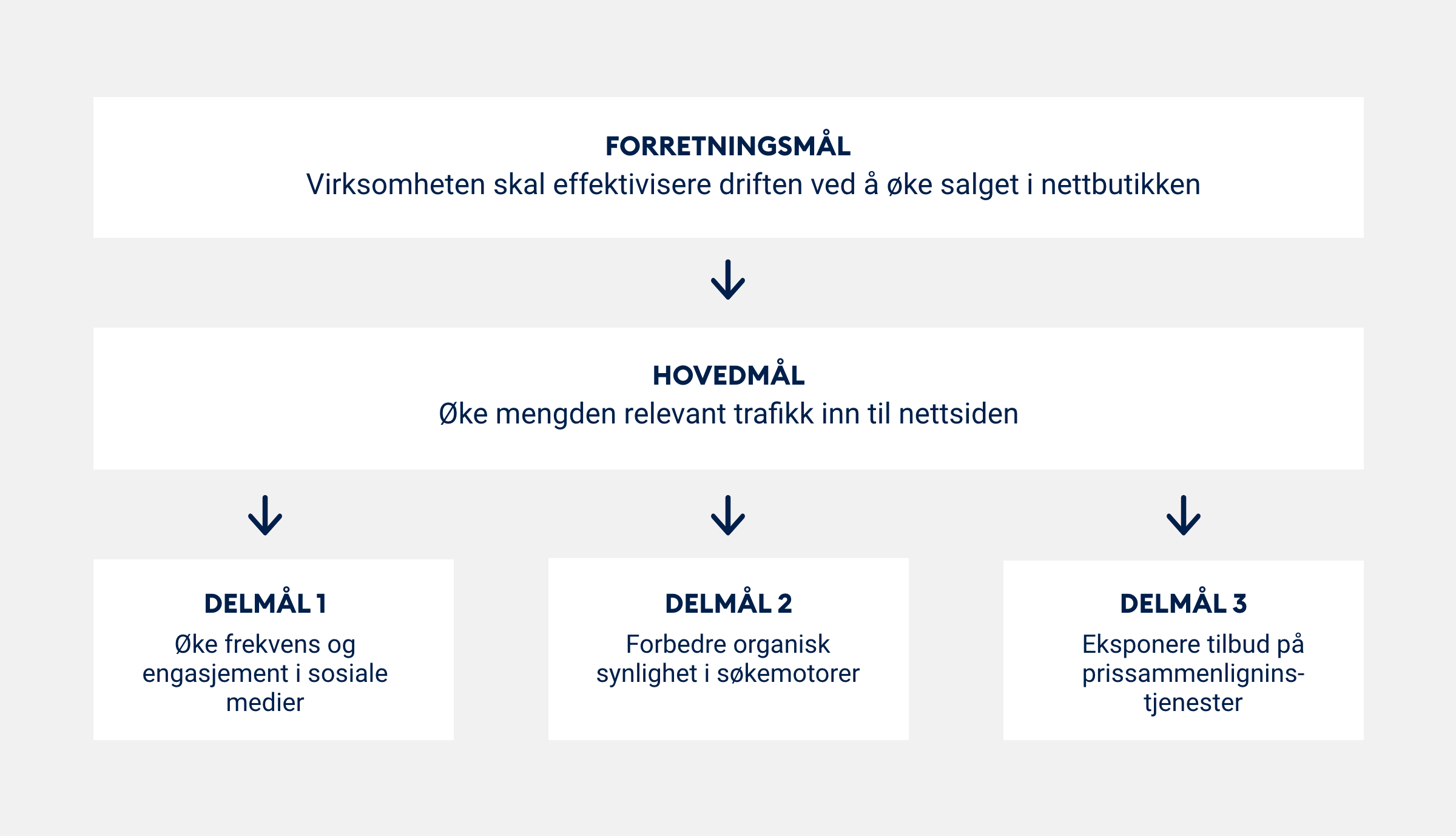 Et målhierarki er én måte å gjøre det på (sett de overordnede målene på toppen og delmålene som leder deg dit, nedover). Skill gjerne mellom kvantitative og kvalitative mål.