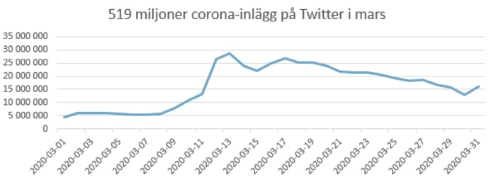 Mängden inlägg på Twitter i mars som handlat om coronaviruset uppnår sällan skådade nivåer. Från den 1 till 31 mars har över en halv miljard tweets om corona gjorts världen över. Det är över 16 miljoner tweets om dagen!